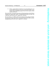 Deutscher Bundestag – 19. Wahlperiode –9– Drucksache 19/157 Vorabfassung - wird durch die lektorierte Version ersetzt. 17. Welche „sonstigen Musikveranstaltungen“ der extremen Rechten hat es seit dem Jahr 2009 in Ergänzung zu den von der Fraktion DIE LINKE. seit den erfragten Musikveranstaltungen gegeben (bitte nach Jahr, Quartal, Datum und Ort aufschlüsseln)? Für das Jahr 2017 wird auf die Antworten der Bundesregierung auf die Kleinen Anfragen der Fraktion DIE LINKE. auf Bundestagsdrucksachen 18/12264 vom 8. Mai 2017 und 18/13256 vom 4. August 2017 verwiesen. Für den Zeitraum von 2009 bis 2016 wird ergänzend auf die Antwort der Bun- desregierung zu Frage 18 der Kleinen Anfrage der Fraktion DIE LINKE. auf Bun- destagsdrucksache 18/13256 vom 4. August 2017 verwiesen.