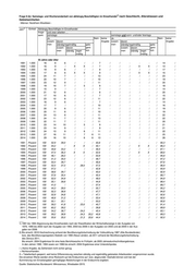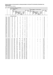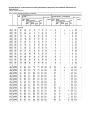1) Frage 9 (b): Samstags- und Wochenendarbeit von abhängig Beschäftigten im Einzelhandel nach Geschlecht, Altersklassen und Gebietseinheiten - Männer: Schleswig-Holstein, Hamburg und Niedersachsen - 2) Einheit Abhängig Beschäftigte im Einzelhandel Jahr Insge- und zwar arbeiten … samt samstags samstags und sonn- und/oder feiertags Ja Nein keine Ja Nein keine zusam- davon Angabe zusam- davon Angabe men ständig/regelmäßig gele- men ständig/regelmäßig gele- zusam- davon gent- zusam- davon gent- men ständig regel- lich men ständig regel- lich mäßig mäßig 55 Jahre oder älter 1991 1.000 5 / / / / / / / / / / / / / / 1992 1.000 6 / / X X / / / / - X X / 5 / 1993 1.000 7 / / / / / / / / - - - / 6 / 1994 1.000 7 / / X X / / / / / X X - 5 / 1995 1.000 8 / / / / / / / / - - - / 7 / 1996 1.000 7 / / / / - 5 / - - - - - 7 / 1997 1.000 10 6 / / / / / / / - - - / 9 / 1998 1.000 8 6 / / / / / - / / / / - 8 - 1999 1.000 6 / / / / / / - / / - / - 5 - 2000 1.000 7 / / / / / / - / / / - / 6 - 2001 1.000 9 / / / / / 5 - / - - - / 8 - 2002 1.000 11 / / / / / 7 - / - - - / 10 - 2003 1.000 9 5 / / / / / - / / - / - 8 - 2004 1.000 7 / / / / / / - / - - - / 6 - 2005 1.000 7 / / / / / / - / / / - / 7 - 2006 1.000 7 / / / / / / - - - - - - 7 - 2007 1.000 6 / / / / / / - / / - / / 6 - 2008 1.000 7 / / / / / / - / / / - / 6 - 2009 1.000 8 / / / / / / - / / / / / 7 - 2010 1.000 7 / / / / / / - / / / / / 6 - 2011 1.000 6 / / / / / / - / / / / / / - 2012 1.000 8 / / / / / / - / / / / / 7 - 2013 1.000 10 5 / / / / / - / / - / / 9 - 2014 1.000 11 5 / / / / 6 - / / - / / 10 - 1991 Prozent 100 / / / / / / / / / / / / / / 1992 Prozent 100 / / X X / / / / - X X / 82,5 / 1993 Prozent 100 / / / / / / / / - - - / 93,6 / 1994 Prozent 100 / / X X / / / / / X X - 80,5 / 1995 Prozent 100 / / / / / / / / - - - / 94,4 / 1996 Prozent 100 / / / / - 72,8 / - - - - - 96,4 / 1997 Prozent 100 57,2 / / / / / / / - - - / 89,0 / 1998 Prozent 100 70,8 / / / / / - / / / / - 92,7 - 1999 Prozent 100 / / / / / / - / / - / - 95,4 - 2000 Prozent 100 / / / / / / - / / / - / 88,8 - 2001 Prozent 100 / / / / / 61,5 - / - - - / 96,7 - 2002 Prozent 100 / / / / / 63,3 - / - - - / 97,3 - 2003 Prozent 100 61,0 / / / / / - / / - / - 93,9 - 2004 Prozent 100 / / / / / / - / - - - / 96,0 - 2005 Prozent 100 / / / / / / - / / / - / 96,7 - 2006 Prozent 100 / / / / / / - - - - - - 100,0 - 2007 Prozent 100 / / / / / / - / / - / / 94,7 - 2008 Prozent 100 / / / / / / - / / / - / 93,5 - 2009 Prozent 100 / / / / / / - / / / / / 90,7 - 2010 Prozent 100 / / / / / / - / / / / / 89,7 - 2011 Prozent 100 / / / / / / - / / / / / / - 2012 Prozent 100 / / / / / / - / / / / / 87,6 - 2013 Prozent 100 52,3 / / / / / - / / - / / 97,4 - 2014 Prozent 100 47,6 / / / / 52,5 - / / - / / 88,5 - ___ 1) 1991 bis 1994 Abgrenzung des Einzelhandels nach der Klassifikation der Wirtschaftszweige in der Ausgabe von 1979, 1995 bis 2002 nach der Ausgabe von 1993, 2003 bis 2008 in der Ausgabe von 2003 und ab 2009 in der Aus- gabe von 2008. 2) Bis einschl. 2010 Hochrechnung anhand der Bevölkerungsfortschreibung der Volkszählung 1987 (Alte Bundesländer) bzw. des Bevölkerungsregisters Statistik von 1990 (Neue Länder), ab 2011 anhand der Bevölkerungsfortschreibung des Zensus 2011. Bis einschl. 2004 Ergebnisse für eine feste Berichtswoche im Frühjahr; ab 2005 Jahresdurchschnittsergebnisse. In den Jahren 1992, 1994 sowie von 1996 bis einschl. 2004 Ergebnisse einer Unterstichprobe. / = Keine Angabe, da Zahlenwert nicht sicher genug. = Nichtsvorhanden. X = Tabellenfach gesperrt, weil keine Differenzierung zwischen ständig und regelmäßig geleiseten Arbeitszeiten vorgenommen wurde. Die einzelnen Werte werden ohne Rücksicht auf die Endsumme auf- bzw. abgerundet. Deshalb können sich bei der Summierung von Einzelangaben geringfügige Abweichungen in der Endsumme ergeben. Quelle: Statistisches Bundesamt: Mikrozensus, Wiesbaden 2015.