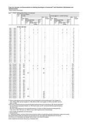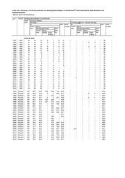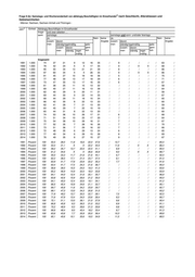 1) Frage 9 (b): Samstags- und Wochenendarbeit von abhängig Beschäftigten im Einzelhandel nach Geschlecht, Altersklassen und Gebietseinheiten - Männer: Bayern - 2) Einheit Abhängig Beschäftigte im Einzelhandel Jahr Insge- und zwar arbeiten … samt samstags samstags und sonn- und/oder feiertags Ja Nein keine Ja Nein keine zusam- davon Angabe zusam- davon Angabe men ständig/regelmäßig gele- men ständig/regelmäßig gele- zusam- davon gent- zusam- davon gent- men ständig regel- lich men ständig regel- lich mäßig mäßig 55 Jahre oder älter 1991 1.000 11 6 / / / / / / / / / - / 10 / 1992 1.000 9 / / X X / / / / / X X - 8 / 1993 1.000 11 7 / / / / / - / / / / / 10 - 1994 1.000 13 9 6 X X / / / / / X X / 12 / 1995 1.000 14 7 / / / / 7 / / / / / / 13 / 1996 1.000 12 6 / / / / 6 - / - - - / 12 - 1997 1.000 14 5 / / / / 9 / / / / / / 13 / 1998 1.000 11 / / / / / 6 - / - - - / 10 - 1999 1.000 12 / / / / / 7 / / - - - / 12 / 2000 1.000 10 5 / / / / / / / / / - / 9 / 2001 1.000 12 8 5 / / / / - / / - / / 11 - 2002 1.000 13 8 5 / / / / - / / - / / 11 - 2003 1.000 11 / / / / / 6 / / / - / - 10 / 2004 1.000 14 7 / / / / 6 - / / / / / 12 - 2005 1.000 13 6 / / / / 8 - / / / - / 13 - 2006 1.000 15 7 / / / / 8 - / / / - / 15 - 2007 1.000 13 7 / / / / 6 - / / / - / 12 - 2008 1.000 11 7 / / / / / - / / / / / 11 - 2009 1.000 12 7 / / / / 5 - / / / / / 12 - 2010 1.000 14 8 5 / / / 6 - / / / / / 12 - 2011 1.000 15 8 / / / / 7 - / / / / / 14 - 2012 1.000 17 10 6 / / / 7 - / / / / / 15 - 2013 1.000 20 11 8 / / / 9 - / / / / / 18 - 2014 1.000 18 9 5 / / / 9 - / / / / / 16 - 1991 Prozent 100 51,8 / / / / / / / / / - / 94,1 / 1992 Prozent 100 / / X X / / / / / X X - 89,7 / 1993 Prozent 100 61,2 / / / / / - / / / / / 95,1 - 1994 Prozent 100 64,3 47,9 X X / / / / / X X / 88,2 / 1995 Prozent 100 51,2 / / / / 48,0 / / / / / / 92,2 / 1996 Prozent 100 51,0 / / / / 49,0 - / - - - / 97,7 - 1997 Prozent 100 34,7 / / / / 63,5 / / / / / / 92,4 / 1998 Prozent 100 / / / / / 53,4 - / - - - / 90,8 - 1999 Prozent 100 / / / / / 61,8 / / - - - / 96,2 / 2000 Prozent 100 51,4 / / / / / / / / / - / 88,1 / 2001 Prozent 100 65,9 43,0 / / / / - / / - / / 90,5 - 2002 Prozent 100 60,4 43,2 / / / / - / / - / / 89,6 - 2003 Prozent 100 / / / / / 53,4 / / / - / - 94,7 / 2004 Prozent 100 54,2 / / / / 45,8 - / / / / / 89,6 - 2005 Prozent 100 42,7 / / / / 57,3 - / / / - / 97,4 - 2006 Prozent 100 44,2 / / / / 55,8 - / / / - / 97,7 - 2007 Prozent 100 54,7 / / / / 45,3 - / / / - / 93,5 - 2008 Prozent 100 60,0 / / / / / - / / / / / 92,0 - 2009 Prozent 100 56,0 / / / / 44,0 - / / / / / 94,5 - 2010 Prozent 100 54,7 37,3 / / / 45,3 - / / / / / 88,8 - 2011 Prozent 100 54,4 / / / / 45,6 - / / / / / 90,4 - 2012 Prozent 100 56,9 33,4 / / / 43,1 - / / / / / 87,7 - 2013 Prozent 100 54,4 38,0 / / / 45,6 - / / / / / 91,4 - 2014 Prozent 100 48,4 31,2 / / / 51,6 - / / / / / 91,7 - ___ 1) 1991 bis 1994 Abgrenzung des Einzelhandels nach der Klassifikation der Wirtschaftszweige in der Ausgabe von 1979, 1995 bis 2002 nach der Ausgabe von 1993, 2003 bis 2008 in der Ausgabe von 2003 und ab 2009 in der Aus- gabe von 2008. 2) Bis einschl. 2010 Hochrechnung anhand der Bevölkerungsfortschreibung der Volkszählung 1987 (Alte Bundesländer) bzw. des Bevölkerungsregisters Statistik von 1990 (Neue Länder), ab 2011 anhand der Bevölkerungsfortschreibung des Zensus 2011. Bis einschl. 2004 Ergebnisse für eine feste Berichtswoche im Frühjahr; ab 2005 Jahresdurchschnittsergebnisse. In den Jahren 1992, 1994 sowie von 1996 bis einschl. 2004 Ergebnisse einer Unterstichprobe. / = Keine Angabe, da Zahlenwert nicht sicher genug. = Nichtsvorhanden. X = Tabellenfach gesperrt, weil keine Differenzierung zwischen ständig und regelmäßig geleiseten Arbeitszeiten vorgenommen wurde. Die einzelnen Werte werden ohne Rücksicht auf die Endsumme auf- bzw. abgerundet. Deshalb können sich bei der Summierung von Einzelangaben geringfügige Abweichungen in der Endsumme ergeben. Quelle: Statistisches Bundesamt: Mikrozensus, Wiesbaden 2015.