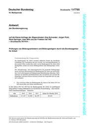 Drucksache 19/7785 –2– Deutscher Bundestag – 19. Wahlperiode Vorabfassung - wird durch die lektorierte Version ersetzt. 2. Wie viele Bildungsträger erzielten nach Kenntnis der Bundesregierung in den Jahren 2015 bis 2018 einen Umsatz mit der Bundesagentur für Arbeit von a) weniger als 100 000 Euro, b) 100 000 bis 500 000 Euro, c) 500 000 bis 2 500 000 Euro, d) mehr als 2 500 000 Euro (bitte nach Jahren aufschlüsseln)? Der Bundesregierung liegen über den Umsatz, den Bildungsträger mit der Bun- desagentur für Arbeit erzielt haben, keine Erkenntnisse vor. Nach Mitteilung der Bundesagentur für Arbeit ist eine entsprechende Auswertung ihres Finanzsystems auf Ebene der Bildungsträger nicht möglich. Für eine Erfassung der Umsätze wird kein Bedarf gesehen, da sie auf die Qualitätssicherung von Trägern und Maßnah- men der Arbeitsförderung keinen Einfluss haben. Aus diesem Grund können auch bei den folgenden Fragen keine Aussagen in Bezug auf die Umsätze gemacht werden. 3. Wie viele Kontrollen wurden nach Kenntnis der Bundesregierung bei Bil- dungsträgern in den Jahren 2015 bis 2018 von fachkundigen Stellen durchge- führt (bitte nach Jahren und Umsatz nach Bildungsträgern mit a) weniger als 100 000 Euro, b) 100 000 bis 500 000 Euro, c) 500 000 bis 2 500 000 Euro, d) mehr als 2 500 000 Euro Jahresumsatz aufschlüsseln)? Die fachkundigen Stellen haben bei den Bildungsträgern auch nach einer erfolg- reichen (Erst-)Prüfung und Zulassung in jährlichen Abständen zu prüfen, ob diese ein System zur Sicherung der Qualität wirksam anwenden (§ 181 Absatz 5 Satz 2 i. V. m. § 177 Absatz 3 des Dritten Buches Sozialgesetzbuch – SGB III). Dabei wird die wirksame Anwendung des Qualitätsmanagementsystems des jeweiligen Trägers insbesondere vor dem Hintergrund der Durchführung seiner Maßnahmen überprüft. Diese Überwachung schließt die Standorte des Trägers mit ein. Der Deutschen Akkreditierungsstelle GmbH (DAkkS), die die fachkundigen Stellen akkreditiert, liegen keine Zahlen darüber vor, wie viele Kontrollen die fachkun- digen Stellen durchgeführt haben. 4. In wie vielen Fällen kam es nach Kenntnis der Bundesregierung bei Bildungs- trägern aufgrund von Prüfungen fachkundiger Stellen in den Jahren 2015 bis 2018 zur Androhung der Vertragsauflösung aufgrund festgestellter Mängel (bitte nach Jahren und Umsatz nach Bildungsträgern mit a) weniger als 100 000 Euro, b) 100 000 bis 500 000 Euro, c) 500 000 bis 2 500 000 Euro, d) mehr als 2 500 000 Euro Jahresumsatz aufschlüsseln)? Der Bundesregierung liegen keine Informationen vor, in wie vielen Fällen Bil- dungsträgern im Verlauf der einzelnen privatrechtlichen Verbindungen zwischen den Trägern und den fachkundigen Stellen eine Vertragsauflösung angedroht worden ist. Weder die DAkkS noch die Bundesagentur für Arbeit haben über den Verlauf der einzelnen privatrechtlichen Verbindungen zwischen den Trägern und den fachkundigen Stellen Kenntnis.