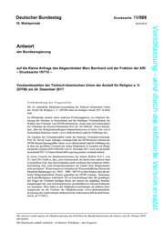 Deutscher Bundestag Drucksache 19/988 19. Wahlperiode 28.02.2018 Vorabfassung - wird durch die lektorierte Version ersetzt. Antwort der Bundesregierung auf die Kleine Anfrage des Abgeordneten Marc Bernhard und der Fraktion der AfD – Drucksache 19/710 – Vorstandswahlen der Türkisch-Islamischen Union der Anstalt für Religion e. V. (DITIB) am 24. Dezember 2017 Vorbemerkung der Fragesteller Die 16. ordentliche Mitgliederversammlung der Türkisch Islamischen Union der Anstalt für Religion e. V. (DITIB) fand am Heiligen Abend 2017 in Köln statt. Im Mittelpunkt standen neben mehreren Positionspapieren zur religiösen Be- treuung der Muslime in Deutschland und der künftigen Verbandstruktur die Wahlen zum Vorstand. Laut DITIB-Internetseite „freute man sich insbesondere der Teilnahme des Diyanet-Präsidenten Prof. Dr. Ali ERBAŞ“. Dieser betonte, dass „über die Religionsbeauftragten bedauerlicherweise in letzter Zeit viel in Deutschland diskutiert wurde“ (www.ditib.de/detail1.php?id=630&lang=de). Als Ergebnis der Vorstandswahlen wurde der bisherige Vorstandsvorsitzende, Prof. Dr. Nevzat Yaşar Aşikoğlu, wiedergewählt, der DITIB bereits während der DITIB-Diyanet-Spionageaffäre leitete (www.ditib.de/detail1.php?id=630&lang=de). In dem neu gewählten Vorstand mit sieben Mitgliedern ist weiterhin ein Religi- onsattaché vertreten (ZEIT ONLINE vom 25. Dezember 2017, www.zeit.de/politik/ deutschland/2017-12/islamverband-ditib-regierung-partner-vorstandswahlen). In einem Vermerk des Bundesministeriums des Innern, Referat M II 3, vom 25. April 2013 heißt es, dass „eine Gemeinschaft, die durch einen anderen Staat so beeinflusst wird, dass ihre Grundsätze nicht Ausdruck ihrer religiösen Selbst- bestimmung sind, nicht Kooperationspartner der Länder beim Religionsunter- richt sein (kann)“. Weiter kommt ein Gutachten der Wissenschaftlichen Dienste des Deutschen Bundestages (Az.: WD1 – 3000 – 007/13) zu dem Schluss, dass das tür- kische Religionspräsidium Diyanet gegenüber der DITIB Leitungs-, Steuerungs- und Kontrollbefugnisse wahrnimmt. Der an Entscheidungen über alle grundlegen- den Fragen des Verbands beteiligte Beirat, der zumeist die endgültige Entschei- dungsbefugnis hat, setzt sich beispielsweise ausschließlich aus Diyanet-Funktionä- ren zusammen. Diese haben in den Mitgliederversammlungen ein größeres Stim- mengewicht als die Vertreter der Mitgliedsvereine (www.deutschlandfunk. de/satzung-des-islamverbands-ditibtuerkische-funktionaere.886.de.html?dram: article_id=375487). Die Antwort wurde namens der Bundesregierung mit Schreiben des Bundesministeriums des Innern vom 26. Februar 2018 übermittelt. Die Drucksache enthält zusätzlich – in kleinerer Schrifttype – den Fragetext.