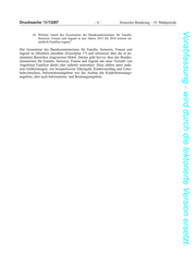 Drucksache 19/13267 –6– Deutscher Bundestag – 19. Wahlperiode 10. Welcher Anteil des Gesamtetats des Bundesministeriums für Familie, Senioren, Frauen und Jugend in den Jahren 2015 bis 2018 kommt tat- sächlich Familien zugute? Der Gesamtetat des Bundesministeriums für Familie, Senioren, Frauen und Jugend ist öffentlich einsehbar (Einzelplan 17) und informiert über die in be- stimmten Bereichen eingesetzten Mittel. Daraus geht hervor, dass das Bundes- ministerium für Familie, Senioren, Frauen und Jugend mit einer Vielzahl von Angeboten Familien direkt oder indirekt unterstützt. Dazu zählen unter ande- rem Geldleistungen, wie beispielsweise Elterngeld, Kinderzuschlag und Unter- haltsvorschuss, Infrastrukturangebote wie der Ausbau der Kinderbetreuungs- angebote, aber auch Informations- und Beratungsangebote.