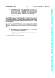 K or re kt ur Drucksache 18/5628 – 10 – Deutscher Bundestag – 18. Wahlperiode Vorabfassung - wird durch die lektorierte Version ersetzt. 17. Plant die Bundesregierung, Kinder und Jugendliche in Ergänzung zu den Personensorgeberechtigten zu eigenständigen Leistungsberechtigten ins- besondere für Leistungen im Bereich der Hilfen zur Erziehung (§ 27 SGB VIII) und bei dem Recht auf Beratung ohne Kenntnis der Personen- sorgeberechtigten (§ 8 Absatz 3 SBG VIII) im SGB VIII zu machen? Wenn nein, warum nicht? Die Stärkung der Rechte von Kindern und Jugendlichen und ihren Familien ist ein zentrales Anliegen der Bundesregierung. Im Rahmen von Bund-Länder- Arbeitsgruppen werden unter Beteiligung von Kommunen und Fachverbänden unterschiedliche gesetzliche Instrumente hierzu erörtert. Der Prozess ist noch nicht abgeschlossen. Die Verankerung eines uneingeschränkten Beratungsanspruchs für Kinder und Jugendliche im SGB VIII ist Gegenstand des Gesamtkonzepts für den Schutz von Kindern und Jugendlichen vor sexueller Gewalt, das schrittweise umgesetzt wird. 18. Plant die Bundesregierung eine Novellierung der §§ 45 ff. SGB VIII (Er- laubnis für den Betrieb einer Einrichtung)? Wenn ja, welche Aspekte sollen geändert werden, und wie sieht der dies- bezügliche Zeitplan aus? Es wird auf die Antwort zu Frage 4 verwiesen. K:\Publishing\Produktion\BT\Produktion\07_Fahne\1805628\1805628.fm, 30. Juli 2015, Seite 10 ur kt re or K