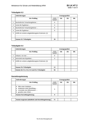 BI LK HT 2 Ministerium für Schule und Weiterbildung NRW Seite 7 von 9 Teilaufgabe II.3 Anforderungen Lösungsqualität Der Prüfling maximal erreichbare Punktzahl 1 beschreibt die Versuchsergebnisse … 6 2 wertet die Ergebnisse … 4 3 beschreibt die Versuchsergebnisse … 8 4 wertet die Ergebnisse … 8 5 erfüllt ein weiteres aufgabenbezogenes Kriterium: (2) …………………………………………………………….. …………………………………………………………….. Summe II.3 Teilaufgabe EK ZK DK 26 Teilaufgabe II.4 Anforderungen Lösungsqualität Der Prüfling maximal erreichbare Punktzahl 1 erläutert, wie eine … 8 2 entwickelt eine Hypothese … 4 3 erfüllt ein weiteres aufgabenbezogenes Kriterium: (2) …………………………………………………………….. …………………………………………………………….. Summe II.4 Teilaufgabe 12 Summe der II.1, II.2, II.3 und II.4 Teilaufgabe 66 EK ZK DK Darstellungsleistung Anforderungen Lösungsqualität Der Prüfling führt seine Gedanken … strukturiert seine Darstellung … verwendet eine differenzierte … gestaltet seine Arbeit … Summe Darstellungsleistung maximal erreichbare Punktzahl 9 9 Summe insgesamt (inhaltliche und Darstellungsleistung) Nur für den Dienstgebrauch! 75 EK ZK DK