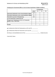 BI LK HT 2 Ministerium für Schule und Weiterbildung NRW Seite 8 von 9 Festlegung der Gesamtnote (Bitte nur bei der letzten bearbeiteten Aufgabe ausfüllen.) Lösungsqualität maximal erreichbare Punktzahl Übertrag der Punktsumme aus der ersten bearbeiteten Aufgabe 75 Übertrag der Punktsumme aus der zweiten bearbeiteten Aufgabe 75 Punktzahl der gesamten Prüfungsleistung 150 EK ZK DK aus der Punktsumme resultierende Note Note ggf. unter Absenkung um ein bis zwei Notenpunkte gemäß § 13 Abs. 2 APO-GOSt Paraphe ggf. arithmetisches Mittel der Punktsummen aus EK und ZK: ___________ ggf. arithmetisches Mittel der Notenurteile aus EK und ZK: _____________ Die Klausur wird abschließend mit der Note: ________________________ (____ Punkte) bewertet. Unterschrift, Datum: Nur für den Dienstgebrauch!