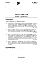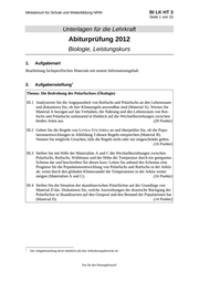 BI BIL E GK ?? 1 BI LK HT 3 Seite 1 von 5 Name: _______________________ Abiturprüfung 2012 Biologie, Leistungskurs Aufgabenstellung: Thema: Die Bedrohung des Polarfuchses (Ökologie) III.1 Analysieren Sie die Angepasstheit von Rotfuchs und Polarfuchs an den Lebensraum und diskutieren Sie, ob hier Klimaregeln anwendbar sind (Material A). Werten Sie Material A bezogen auf das Verhalten, die Nahrung und den Lebensraum von Rot- fuchs und Polarfuchs umfassend in Hinblick auf die Wechselbeziehungen zwischen beiden Arten aus. (20 Punkte) III.2 Geben Sie die Regeln von LOTKA-VOLTERRA an und überprüfen Sie, ob die Popu- lationsentwicklungen in Abbildung 3 diesen Regeln entsprechen (Material B). Nennen Sie mögliche Ursachen, falls die Regeln nicht oder nur eingeschränkt gelten. (16 Punkte) III.3 Stellen Sie mit Hilfe der Materialien A und C die Wechselbeziehungen zwischen Polarfuchs, Rotfuchs, Wühlmaus und der Höhe der Temperatur durch ein geeignetes Schema dar und beschreiben Sie dieses kurz. Leiten Sie anhand des Schemas eine Prognose für die Populationsentwicklung von Polarfuchs und Rotfuchs in der Arktis ab, wenn durch den globalen Klimawandel die Temperaturen in der Arktis weiter steigen (Materialien A und C). (16 Punkte) III.4 Stellen Sie die Situation der skandinavischen Polarfüchse auf der Grundlage von Material D dar. Diskutieren Sie, welche Auswirkungen der drastische Rückgang der Polarfüchse in Skandinavien auf den Genpool und den Bestand der Populationen hat (Material D). (14 Punkte) Zugelassene Hilfsmittel: Wörterbuch zur deutschen Rechtschreibung Nur für den Dienstgebrauch!