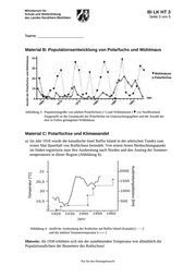 BI BIL E GK ?? 1 BI LK HT 3 Seite 3 von 5 Name: _______________________ Anzahl der Polarfüchse und Wühlmäuse Material B: Populationsentwicklung von Polarfuchs und Wühlmaus Wühlmäuse Polarfüchse Abbildung 3: Populationsgröße von adulten Polarfüchsen (○) und Wühlmäusen (▼) in Nordfinnland. Dargestellt ist die Gesamtzahl der Polarfüchse im Untersuchungsgebiet und die Anzahl der dort in Fallen gefangenen Wühlmäuse. Material C: Polarfüchse und Klimawandel a) Im Jahr 1918 wurde die kanadische Insel Baffin Island in der arktischen Tundra zum ersten Mal dauerhaft von Rotfüchsen besiedelt. Von einem festen Beobachtungspunkt im Süden registrierte man ihre Ausbreitung nach Norden und den Anstieg der Sommer- temperaturen in dieser Region (Abbildung 4). Temperatur [°C] Ausbreitungsdistanz [km] Abbildung 4: nördliche Ausbreitung der Rotfüchse auf Baffin Island (Kanada) [- - - -] und die mittlere Sommertemperatur [ ] Hinweis: Ab 1930 erhöhten sich mit der zunehmenden Temperatur erst allmählich die Populationsdichten der Beutetiere des Rotfuchses! Nur für den Dienstgebrauch!