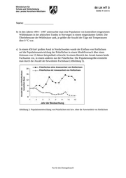 BI BIL E GK ?? 1 BI LK HT 3 Seite 4 von 5 Name: _______________________ b) In den Jahren 1994 – 1997 untersuchte man eine Population von kontrolliert eingesetzten Wühlmäusen in der arktischen Tundra in Norwegen in einem eingezäunten Gebiet. Die Überlebensrate der Wühlmäuse sank, je größer die Anzahl der Tage mit Temperaturen über 0 °C war. c) In einem 450 km² großen Areal in Nordschweden wurde der Einfluss von Rotfüchsen auf die Populationsentwicklung der Polarfüchse in einem Modellversuch über einen Zeitraum von 15 Jahren beispielhaft erforscht. In einem Bereich des Areals kamen beide Fuchsarten vor, in einem anderen nur die Polarfüchse. Die Populationsgröße ermittelte man durch die Anzahl der bewohnten Fuchsbaue (Abbildung 5). Anzahl der von Polarfüchsen besetzten Baue Polarfüchse ohne Anwesenheit von Rotfüchsen Polarfüchse mit Anwesenheit von Rotfüchsen Abbildung 5: Populationsentwicklung von Polarfüchsen mit bzw. ohne die Anwesenheit von Rotfüchsen Nur für den Dienstgebrauch!