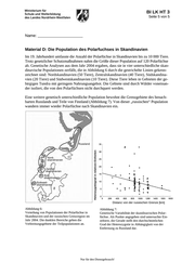 BI BIL E GK ?? 1 BI LK HT 3 Seite 5 von 5 Name: _______________________ Material D: Die Population des Polarfuchses in Skandinavien Im 19. Jahrhundert umfasste die Anzahl der Polarfüchse in Skandinavien bis zu 10 000 Tiere. Trotz gesetzlicher Schutzmaßnahmen nahm die Größe dieser Population auf 120 Polarfüchse ab. Genetische Analysen aus dem Jahr 2004 ergaben, dass sie in vier unterschiedliche skan- dinavische Populationen zerfällt, die in Abbildung 6 durch die gestrichelte Linien gekenn- zeichnet sind: Nordskandinavien (50 Tiere), Zentralskandinavien (40 Tiere), Südskandina- vien (20 Tiere) und Südwestskandinavien (10 Tiere). Diese Tiere leben in Gebieten der ge- birgigen Tundra mit geringem Nahrungsangebot. Die Gebiete sind durch Wälder voneinan- der isoliert, die von den Polarfüchsen nicht durchquert werden. Heterozygotiegrad in relativen Einheiten Eine weitere genetisch unterschiedliche Population bewohnt die Grenzgebiete des benach- barten Russlands und Teile von Finnland (Abbildung 7). Von dieser „russischen“ Population wandern immer wieder Polarfüchse nach Skandinavien ein. Distanz von der russischen Grenze [km] Abbildung 6: Verteilung von Populationen der Polarfüchse in Skandinavien und der russischen Grenzregion im Jahr 2004. Die dunklen Bereiche geben die Verbreitungsgebiete der Teilpopulationen an. Abbildung 7: Genetische Variabilität der skandinavischen Polar- füchse. Als Punkte angegeben sind untersuchte Ein- zeltiere, die Gerade stellt den durchschnittlichen Grad der Heterozygotie in Abhängigkeit von der Entfernung zu Russland dar. Nur für den Dienstgebrauch!
