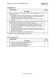 Ministerium für Schule und Weiterbildung NRW BI GK HT 3 Seite 5 von 8 Teilaufgabe III.3 Anforderungen Der Prüfling maximal erreichbare Punktzahl 1 fasst die wesentlichen Aussagen zusammen, die sich den Abbildungen 3 und 4 ent- nehmen lassen, z. B.: Mit steigender Temperatur breitet sich der Rotfuchs auf Baffin Island in nördlicher Richtung aus, und zwar mit zeitlicher Verzögerung, weil die Dichte der Beute- populationen des Rotfuchses erst allmählich zunimmt. In Gebieten mit gemeinsamem Vorkommen wird der Polarfuchs vom Rotfuchs verdrängt. 6 2 beurteilt die Überlebenschancen des Polarfuchses, wenn bedingt durch den globalen Klimawandel die Temperaturen in der Arktis weiter steigen, z. B.: Die globale Erwärmung begünstigt das Vordringen des Rotfuchses in die Arktis, da er eine schlechte Angepasstheit an extrem niedrige Temperaturen zeigt. Der Polarfuchs wird aufgrund von interspezifischer Konkurrenz vom Rotfuchs verdrängt bzw. dezimiert. Wenn das Konkurrenzausschlussprinzip auch für die Beziehung zwischen den beiden betrachteten Fuchsarten gilt, ist auch das Aussterben des Polarfuchses als Folge des Klimawandels denkbar. Andere sinnvolle Lösungen werden entsprechend gewertet. 10 3 erfüllt ein weiteres aufgabenbezogenes Kriterium. (2) b) Darstellungsleistung Anforderungen Der Prüfling führt seine Gedanken schlüssig, stringent und klar aus. strukturiert seine Darstellung sachgerecht. verwendet eine differenzierte und präzise Sprache. gestaltet seine Arbeit formal ansprechend. Nur für den Dienstgebrauch! maximal erreichbare Punktzahl 6