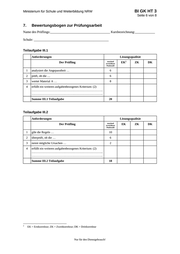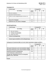 BI GK HT 3 Ministerium für Schule und Weiterbildung NRW Seite 6 von 8 7. Bewertungsbogen zur Prüfungsarbeit Name des Prüflings:____________________________________ Kursbezeichnung:____________ Schule: _____________________________________________ Teilaufgabe III.1 Anforderungen Lösungsqualität Der Prüfling maximal erreichbare Punktzahl 1 analysiert die Angepasstheit … 6 2 prüft, ob die … 6 3 wertet Material A … 8 4 erfüllt ein weiteres aufgabenbezogenes Kriterium: (2) …………………………………………………………….. …………………………………………………………….. Summe III.1 Teilaufgabe EK 2 ZK DK 20 Teilaufgabe III.2 Anforderungen Lösungsqualität Der Prüfling 1 gibt die Regeln … 10 2 überprüft, ob die … 6 3 nennt mögliche Ursachen … 2 4 erfüllt ein weiteres aufgabenbezogenes Kriterium: (2) …………………………………………………………….. …………………………………………………………….. Summe III.2 Teilaufgabe 2 maximal erreichbare Punktzahl 18 EK = Erstkorrektur; ZK = Zweitkorrektur; DK = Drittkorrektur Nur für den Dienstgebrauch! EK ZK DK