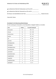BI GK HT 3 Ministerium für Schule und Weiterbildung NRW Seite 8 von 8 ggf. arithmetisches Mittel der Punktsummen aus EK und ZK: ___________ ggf. arithmetisches Mittel der Notenurteile aus EK und ZK: _____________ Die Klausur wird abschließend mit der Note: ________________________ (____ Punkte) bewertet. Unterschrift, Datum: Grundsätze für die Bewertung (Notenfindung) Für die Zuordnung der Notenstufen zu den Punktzahlen ist folgende Tabelle zu verwenden: Note Punkte Erreichte Punktzahl sehr gut plus 15 120 – 114 sehr gut 14 113 – 108 sehr gut minus 13 107 – 102 gut plus 12 101 – 96 gut 11 95 – 90 gut minus 10 89 – 84 befriedigend plus 9 83 – 78 befriedigend 8 77 – 72 befriedigend minus 7 71 – 66 ausreichend plus 6 65 – 60 ausreichend 5 59 – 54 ausreichend minus 4 53 – 47 mangelhaft plus 3 46 – 39 mangelhaft 2 38 – 32 mangelhaft minus 1 31 – 24 ungenügend 0 23 – 0 Nur für den Dienstgebrauch!