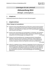Ministerium für Schule und Weiterbildung NRW BI LK HT 3 Seite 2 von 10 3. Materialgrundlage Material A: 4. Abbildung 1 verändert nach Rembold 2006 Material B: Abbildung 2 verändert nach Greenwood et al. 2011 Material D: Tabelle 1 verändert nach Bohn 2007 Abbildung 3 aus Bohn 2007 Rembold, K. (2006). Zur Ökologie der karnivoren Nepenthes madagascariensis, Diplom- arbeit, Rheinische Friedrich-Wilhelms-Universität, Bonn. Bohn, H. F. (2007). Biomechanik von Insekten-Pflanzen-Interaktionen bei Nepenthes- Kannenpflanzen. Dissertation, Bayerische Julius-Maximilians-Universität, Würzburg. Greenwood, M.; Clarke, C.; Lee, C. C.; Gunsalam, A.; Clarke, R. H. (2011). A Unique Resource Mutualism between the Giant Bornean Pitcher Plant, Nepenthes rajah, and Members of a Small Mammal Community. Public Library of Science ONE 6(6): e21114. Bonhomme, V.; Gounand, I.; Alaux, C.; Jousselin, E.; Barthélémy, D.; Gaume, L. (2011). The plant-ant Camponotus schmitzi helps its carnivorous host-plant Nepenthes bicalcarata to catch its prey. Journal of Tropical Ecology 27, 15 – 16 (24) Bezüge zu den Vorgaben 2013 1. Inhaltliche Schwerpunkte Ökologische Verflechtungen und nachhaltige Nutzung Einfache Beziehungen zwischen Organismengruppen und abiotischen Habitatfaktoren – Anpassungen an Temperatur und Feuchtigkeit bei Tieren und Pflanzen Wechselbeziehungen, Populationsdynamik – Beziehungen zwischen Populationen: LOTKA-VOLTERRA-Regeln, Konkurrenz, Koexistenz – Verflechtungen in Lebensgemeinschaften Biomasseproduktion, Trophieebenen, Energiefluss Biogeochemischer Kreislauf am Beispiel des Stickstoffkreislaufs Evolution der Vielfalt des Lebens in Struktur und Verhalten Grundlagen evolutiver Veränderung – Genotypische Variabilität von Populationen (keine Modellberechnungen) Verhalten, Fitness und Anpassung – Fortpflanzungsstrategien (einschließlich Partnerwahl und Paarungssysteme) Art und Artbildung 2. Medien/Materialien entfällt 5. Zugelassene Hilfsmittel Wörterbuch zur deutschen Rechtschreibung Nur für den Dienstgebrauch!