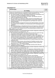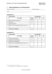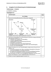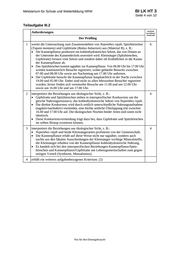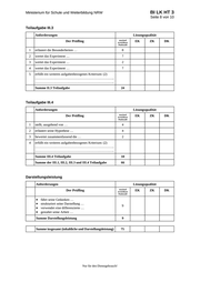 BI LK HT 3 Ministerium für Schule und Weiterbildung NRW Seite 8 von 10 Teilaufgabe III.3 Anforderungen Lösungsqualität Der Prüfling maximal erreichbare Punktzahl 1 erläutert die Besonderheiten … 8 2 wertet das Experiment … 7 3 wertet das Experiment … 2 4 wertet das Experiment … 7 5 erfüllt ein weiteres aufgabenbezogenes Kriterium: (2) …………………………………………………………….. …………………………………………………………….. Summe II.3 Teilaufgabe EK ZK DK 24 Teilaufgabe III.4 Anforderungen Lösungsqualität Der Prüfling maximal erreichbare Punktzahl 1 stellt, ausgehend von … 4 2 erläutert seine Hypothese … 4 3 bewertet zusammenfassend die … 2 4 erfüllt ein weiteres aufgabenbezogenes Kriterium: (2) …………………………………………………………….. …………………………………………………………….. Summe III.4 Teilaufgabe 10 Summe der III.1, III.2, III.3 und III.4 Teilaufgabe 66 EK ZK DK Darstellungsleistung Anforderungen Lösungsqualität Der Prüfling führt seine Gedanken … strukturiert seine Darstellung … verwendet eine differenzierte … gestaltet seine Arbeit … Summe Darstellungsleistung maximal erreichbare Punktzahl 9 9 Summe insgesamt (inhaltliche und Darstellungsleistung) Nur für den Dienstgebrauch! 75 EK ZK DK