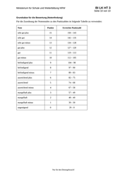 BI LK HT 3 Ministerium für Schule und Weiterbildung NRW Seite 10 von 10 Grundsätze für die Bewertung (Notenfindung) Für die Zuordnung der Notenstufen zu den Punktzahlen ist folgende Tabelle zu verwenden: Note Punkte Erreichte Punktzahl sehr gut plus 15 150 – 143 sehr gut 14 142 – 135 sehr gut minus 13 134 – 128 gut plus 12 127 – 120 gut 11 119 – 113 gut minus 10 112 – 105 befriedigend plus 9 104 – 98 befriedigend 8 97 – 90 befriedigend minus 7 89 – 83 ausreichend plus 6 82 – 75 ausreichend 5 74 – 68 ausreichend minus 4 67 – 58 mangelhaft plus 3 57 – 49 mangelhaft 2 48 – 40 mangelhaft minus 1 39 – 30 ungenügend 0 29 – 0 Nur für den Dienstgebrauch!