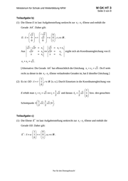 Ministerium für Schule und Weiterbildung NRW M GK HT 3 Seite 3 von 8 Teilaufgabe b) (1) Die Ebene E ist laut Aufgabenstellung senkrecht zur x1 - x2 -Ebene und enthält die Gerade AA . Daher gilt: 2 2 0 E : x 0 r 2 s 0 , r , s IR . 0 0 1 Aus 2 2r x1 2r x2 s x3 2 x1 x2 2r x2 ergibt sich als Koordinatengleichung von E: s x3 x1 x2 2 . [Alternative: Die Gerade AA hat offensichtlich die Gleichung x1 x2 2 . Da E senk- recht zu dieser in der x1 - x2 -Ebene verlaufenden Geraden ist, hat E dieselbe Gleichung.] 1 (2) Es ist OD : x r 1 , r IR [s. o.]. Durch Einsetzen in die Koordinatengleichung von 0 1 1 1 E erhält man rS rS 2 rS 2 und daraus x S 2 1 bzw. den gesuchten 0 2 2 1 1 2 | 0. 2| Schnittpunkt S 2 2 Teilaufgabe c) * (1) Die Ebene E ist laut Aufgabenstellung senkrecht zur x1 - x2 -Ebene und enthält die Gerade OD. Daher gilt: 1 0 * E : x u 1 v 0 , u, v IR . 0 1 Nur für den Dienstgebrauch!