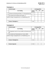 M GK HT 3 Ministerium für Schule und Weiterbildung NRW Seite 5 von 8 7. Teilleistungen – Kriterien / Bewertungsbogen zur Prüfungsarbeit Name des Prüflings:__________________________________ Kursbezeichnung:_________ Schule: _____________________________________________ Teilaufgabe a) Anforderungen Lösungsqualität Der Prüfling maximal erreichbare Punktzahl 1 (1) gibt die Koordinaten des Mittelpunktes der Strecke OD an. 3 2 (2) zeigt, dass die Gerade CM senkrecht zur Geraden OD ist. 5 3 (3) bestimmt den Abstand des Punktes C von der Geraden OD. 4 EK 2 ZK DK Sachlich richtige Lösungsalternative zur Modelllösung: (12) …………………………………………………………………… …………………………………………………………………… Summe Teilaufgabe a) 12 Teilaufgabe b) Anforderungen Lösungsqualität Der Prüfling maximal erreichbare Punktzahl 1 (1) leitet je eine Gleichung der Ebene E in Parameterform und Koordinatenform her. 8 2 (2) bestimmt die Koordinaten des Schnittpunktes S der Ebene E mit der Geraden OD. 6 Sachlich richtige Lösungsalternative zur Modelllösung: (14) …………………………………………………………………… …………………………………………………………………… Summe Teilaufgabe b) 2 14 EK = Erstkorrektur; ZK = Zweitkorrektur; DK = Drittkorrektur Nur für den Dienstgebrauch! EK ZK DK