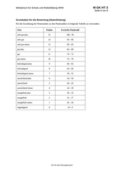M GK HT 3 Ministerium für Schule und Weiterbildung NRW Seite 8 von 8 Grundsätze für die Bewertung (Notenfindung) Für die Zuordnung der Notenstufen zu den Punktzahlen ist folgende Tabelle zu verwenden: Note Punkte Erreichte Punktzahl sehr gut plus 15 100 – 95 sehr gut 14 94 – 90 sehr gut minus 13 89 – 85 gut plus 12 84 – 80 gut 11 79 – 75 gut minus 10 74 – 70 befriedigend plus 9 69 – 65 befriedigend 8 64 – 60 befriedigend minus 7 59 – 55 ausreichend plus 6 54 – 50 ausreichend 5 49 – 45 ausreichend minus 4 44 – 39 mangelhaft plus 3 38 – 33 mangelhaft 2 32 – 27 mangelhaft minus 1 26 – 20 ungenügend 0 19 – 0 Nur für den Dienstgebrauch!