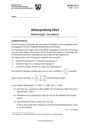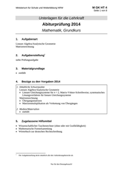 Ministerium für Schule und Weiterbildung NRW M GK HT 4 Seite 1 von 8 Unterlagen für die Lehrkraft Abiturprüfung 2014 Mathematik, Grundkurs 1. Aufgabenart Lineare Algebra/Analytische Geometrie Matrizenrechnung 2. 1 Aufgabenstellung siehe Prüfungsaufgabe 3. Materialgrundlage entfällt 4. Bezüge zu den Vorgaben 2014 1. Inhaltliche Schwerpunkte Lineare Algebra/Analytische Geometrie Lineare Gleichungssysteme für n > 2, Matrix-Vektor-Schreibweise, systematisches Lösungsverfahren für lineare Gleichungssysteme Matrizenrechnung Übergangsmatrizen Matrizenmultiplikation als Verkettung von Übergängen 2. Medien/Materialien entfällt 5. Zugelassene Hilfsmittel Wissenschaftlicher Taschenrechner (ohne oder mit Grafikfähigkeit) Mathematische Formelsammlung Wörterbuch zur deutschen Rechtschreibung 1 Die Aufgabenstellung deckt inhaltlich alle drei Anforderungsbereiche ab. Nur für den Dienstgebrauch!