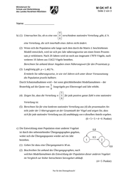 M GK HT 4 Seite 1 von 3 Name: _______________________ Abiturprüfung 2014 Mathematik, Grundkurs Aufgabenstellung: Die Entwicklung der Population einer bestimmten Seevogelart in einem festgelegten Beob- achtungsgebiet wird durch folgende Modellannahmen beschrieben: Die Überlebensrate der Vögel in den ersten beiden Lebensjahren wird jeweils mit 0,6 ange- nommen, in den späteren Lebensjahren mit 0,8. Die erste Brut findet im 3. Lebensjahr statt, der Bruterfolg wird mit 0,5 Jungvögeln pro Elternvogel und Jahr angenommen. Die Vögel werden in drei Altersgruppen eingeteilt, deren Anzahlen x1 : Anzahl der Jungvögel im 1. Lebensjahr (Altersgruppe 1) x2 : Anzahl der Vögel im 2. Lebensjahr (Altersgruppe 2) x3 : Anzahl der Altvögel, die älter als 2 Jahre sind (Altersgruppe 3) x1 1 durch jährliche Zählungen ermittelt und jeweils zu einer Verteilung x x2 zusammen- x 3 0 0,5 0 gefasst werden. Die Matrix L 0,6 0 0 beschreibt dieses Modell. 0 0,6 0,8 a) Die aktuelle Zählung ergibt x1 2000 , x2 4000 und x3 15000 . (1) Berechnen Sie, ausgehend von diesen Zahlen, die Verteilung der Vögel nach einem Jahr und nach 2 Jahren. (2) Bestimmen Sie die Verteilung der Vögel, die sich aus dem Modell für das Vorjahr ergäbe. (3) Fünf Elemente der Matrix L haben den Wert Null. Erklären Sie für jedes dieser Elemente aus dem Sachzusammenhang heraus, warum es den Wert Null hat. (5 + 5 + 5 Punkte) 1 Verteilungsvektoren werden der Einfachheit halber im Folgenden kurz „Verteilung“ genannt. Nur für den Dienstgebrauch!