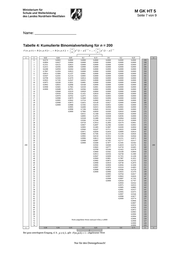 M GK HT 5 Seite 6 von 9 Name: _______________________ Tabelle 3: Kumulierte Binomialverteilung für n = 50 F ( n ; p ; k ) B n ; p ; 0 ... B n ; p ; k n 0 n k n0 nk p 1 p ... p 1 p 0 k p n 50 n k 0,02 0,05 0,1 0,125 0,15 0,2 0,25 0,3 0,4 0,5 0 1 2 3 4 5 6 7 8 9 10 11 12 13 14 15 16 17 18 19 20 21 22 23 24 25 26 27 28 29 30 31 32 33 34 35 36 37 0,3642 0,7358 0,9216 0,9822 0,9968 0,9995 0,9999 0,0769 0,2794 0,5405 0,7604 0,8964 0,9622 0,9882 0,9968 0,9992 0,9998 0,0052 0,0338 0,1117 0,2503 0,4312 0,6161 0,7702 0,8779 0,9421 0,9755 0,9906 0,9968 0,9990 0,9997 0,9999 0,0013 0,0103 0,0418 0,1138 0,2346 0,3935 0,5637 0,7165 0,8339 0,9121 0,9579 0,9817 0,9928 0,9974 0,9991 0,9997 0,9999 0,0003 0,0029 0,0142 0,0460 0,1121 0,2194 0,3613 0,5188 0,6681 0,7911 0,8801 0,9372 0,9699 0,9868 0,9947 0,9981 0,9993 0,9998 0,9999 0,0000 0,0002 0,0013 0,0057 0,0185 0,0480 0,1034 0,1904 0,3073 0,4437 0,5836 0,7107 0,8139 0,8894 0,9393 0,9692 0,9856 0,9937 0,9975 0,9991 0,9997 0,9999 0,0000 0,0000 0,0001 0,0005 0,0021 0,0070 0,0194 0,0453 0,0916 0,1637 0,2622 0,3816 0,5110 0,6370 0,7481 0,8369 0,9017 0,9449 0,9713 0,9861 0,9937 0,9974 0,9990 0,9996 0,9999 0,0000 0,0000 0,0000 0,0000 0,0002 0,0007 0,0025 0,0073 0,0183 0,0402 0,0789 0,1390 0,2229 0,3279 0,4468 0,5692 0,6839 0,7822 0,8594 0,9152 0,9522 0,9749 0,9877 0,9944 0,9976 0,9991 0,9997 0,9999 0,0000 0,0000 0,0000 0,0000 0,0000 0,0000 0,0000 0,0001 0,0002 0,0008 0,0022 0,0057 0,0133 0,0280 0,0540 0,0955 0,1561 0,2369 0,3356 0,4465 0,5610 0,6701 0,7660 0,8438 0,9022 0,9427 0,9686 0,9840 0,9924 0,9966 0,9986 0,9995 0,9998 0,9999 0,0000 0,0000 0,0000 0,0000 0,0000 0,0000 0,0000 0,0000 0,0000 0,0000 0,0000 0,0000 0,0002 0,0005 0,0013 0,0033 0,0077 0,0164 0,0325 0,0595 0,1013 0,1611 0,2399 0,3359 0,4439 0,5561 0,6641 0,7601 0,8389 0,8987 0,9405 0,9675 0,9836 0,9923 0,9967 0,9987 0,9995 0,9998 49 48 47 46 45 44 43 42 41 40 39 38 37 36 35 34 33 32 31 30 29 28 27 26 25 24 23 22 21 20 19 18 17 16 15 14 13 12 0,7 0,6 0,5 k Nicht aufgeführte Werte sind (auf 4 Dez.) 1,0000 0,98 0,95 0,9 0,875 0,85 0,8 0,75 p Bei grau unterlegtem Eingang, d. h. p 0,5 , gilt: F (n; p; k ) 1 abgelesener Wert Nur für den Dienstgebrauch! n 50 n