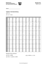 M GK HT 5 Seite 9 von 9 Name: _______________________ Tabelle 6: Normalverteilung z 0,... z 1 z z 0,0 0,1 0,2 0,3 0,4 0,5 0,6 0,7 0,8 0,9 1,0 1,1 1,2 1,3 1,4 1,5 1,6 1,7 1,8 1,9 2,0 2,1 2,2 2,3 2,4 2,5 2,6 2,7 2,8 2,9 3,0 3,1 3,2 3,3 3,4 3,5 3,6 3,7 3,8 0 5000 5398 5793 6179 6554 6915 7257 7580 7881 8159 8413 8643 8849 9032 9192 9332 9452 9554 9641 9713 9772 9821 9861 9893 9918 9938 9953 9965 9974 9981 9987 9990 9993 9995 9997 9998 9998 9999 9999 1 5040 5438 5832 6217 6591 6950 7291 7611 7910 8186 8438 8665 8869 9049 9207 9345 9463 9564 9649 9719 9778 9826 9864 9896 9920 9940 9955 9966 9975 9982 9987 9991 9993 9995 9997 9998 9998 9999 9999 2 5080 5478 5871 6255 6628 6985 7324 7642 7939 8212 8461 8686 8888 9066 9222 9357 9474 9573 9656 9726 9783 9830 9868 9898 9922 9941 9956 9967 9976 9982 9987 9991 9994 9995 9997 9998 9999 9999 9999 3 5120 5517 5910 6293 6664 7019 7357 7673 7967 8238 8485 8708 8907 9082 9236 9370 9484 9582 9664 9732 9788 9834 9871 9901 9925 9943 9957 9968 9977 9983 9988 9991 9994 9996 9997 9998 9999 9999 9999 4 5160 5557 5948 6331 6700 7054 7389 7704 7995 8264 8508 8729 8925 9099 9251 9382 9495 9591 9671 9738 9793 9838 9875 9904 9927 9945 9959 9969 9977 9984 9988 9992 9994 9996 9997 9998 9999 9999 9999 5 5199 5596 5987 6368 6736 7088 7422 7734 8023 8289 8531 8749 8944 9115 9265 9394 9505 9599 9678 9744 9798 9842 9878 9906 9929 9946 9960 9970 9978 9984 9989 9992 9994 9996 9997 9998 9999 9999 9999 6 5239 5636 6026 6406 6772 7123 7454 7764 8051 8315 8554 8770 8962 9131 9279 9406 9515 9608 9686 9750 9803 9846 9881 9909 9931 9948 9961 9971 9979 9985 9989 9992 9994 9996 9997 9998 9999 9999 9999 7 5279 5675 6064 6443 6808 7157 7486 7794 8078 8340 8577 8790 8980 9147 9292 9418 9525 9616 9693 9756 9808 9850 9884 9911 9932 9949 9962 9972 9979 9985 9989 9992 9995 9996 9997 9998 9999 9999 9999 Beispiele für den Gebrauch: 2,32 0,9898 0,9 1 0,9 0,1841 z 0,994 z 2,51 Nur für den Dienstgebrauch! 8 5319 5714 6103 6480 6844 7190 7517 7823 8106 8365 8599 8810 8997 9162 9306 9429 9535 9625 9699 9761 9812 9854 9887 9913 9934 9951 9963 9973 9980 9986 9990 9993 9995 9996 9997 9998 9999 9999 9999 9 5359 5753 6141 6517 6879 7224 7549 7852 8133 8389 8621 8830 9015 9177 9319 9441 9545 9633 9706 9767 9817 9857 9890 9916 9936 9952 9964 9974 9981 9986 9990 9993 9995 9997 9998 9998 9999 9999 9999