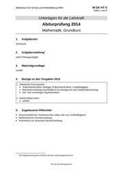 Ministerium für Schule und Weiterbildung NRW M GK HT 5 Seite 1 von 8 Unterlagen für die Lehrkraft Abiturprüfung 2014 Mathematik, Grundkurs 1. Aufgabenart Stochastik 2. 1 Aufgabenstellung siehe Prüfungsaufgabe 3. Materialgrundlage entfällt 4. Bezüge zu den Vorgaben 2014 1. Inhaltliche Schwerpunkte Wahrscheinlichkeit, bedingte Wahrscheinlichkeit, Unabhängigkeit Binomialverteilung einschließlich Erwartungswert und Standardabweichung Ein- und zweiseitiger Hypothesentest 2. Medien/Materialien entfällt 5. Zugelassene Hilfsmittel Wissenschaftlicher Taschenrechner (ohne oder mit Grafikfähigkeit) Mathematische Formelsammlung Wörterbuch zur deutschen Rechtschreibung 1 Die Aufgabenstellung deckt inhaltlich alle drei Anforderungsbereiche ab. Nur für den Dienstgebrauch!