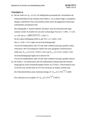 M GK HT 5 Ministerium für Schule und Weiterbildung NRW Seite 4 von 8 Teilaufgabe e) (1) Mit der Wahl von H 0 : p 0,25 als Nullhypothese beschränkt der Verkaufsleiter die Wahrscheinlichkeit für das Auftreten eines Fehlers 1. Art, in dessen Folge er auf größeren Mengen verderblicher Ware sitzen bleiben könnte, durch die [gegebene] Irrtumswahr- scheinlichkeit auf höchstens 0,05. Die Zufallsgröße X: Anzahl weiblicher Zuschauer kann als binomialverteilt ange- nommen werden. Es handelt sich um einen rechtsseitigen Test mit n 1000 , z 1,64 , 250 und 1000 0,25 0,75 13,69 3 . Da die Laplace-Bedingung erfüllt ist, gilt P( X 1,64 ) 0,05 . Mit 1,64 272,5 ergibt sich als Entscheidungsregel: Verwirf die Nullhypothese, falls 273 oder mehr weibliche Zuschauer gezählt werden. [Alternative: Bei Verwendung der Tabelle oder eines geeigneten Taschenrechners erhält man: Pp0,25 X 273 0,0512 0,05 und Pp0,25 X 274 0,0441 0,05 . Als Entscheidungsregel ergibt sich in diesem Fall: Verwirf die Nullhypothese, falls 274 oder mehr weibliche Zuschauer gezählt werden.] (2) Der Fehler 2. Art besteht darin, dass die Nullhypothese [entsprechend der Entschei- dungsregel bei einem Stichprobenergebnis kleiner als 273 [bzw. 274]] irrtümlich nicht verworfen wird, obwohl mehr als 25 % der Zuschauer im Stadion weiblich sind. Tabelle Die Wahrscheinlichkeit seines Auftretens beträgt Pp0,3 ( X 272) 0,0280 . Tabelle [Zur Alternative aus (1) gehört Pp0,3 ( X 273) 0,0329 .] Nur für den Dienstgebrauch!