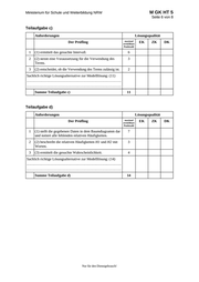 M GK HT 5 Ministerium für Schule und Weiterbildung NRW Seite 6 von 8 Teilaufgabe c) Anforderungen Lösungsqualität Der Prüfling maximal erreichbare Punktzahl 1 (1) ermittelt das gesuchte Intervall. 6 2 (2) nennt eine Voraussetzung für die Verwendung des Terms. 3 3 (2) entscheidet, ob die Verwendung des Terms zulässig ist. 2 EK ZK DK Sachlich richtige Lösungsalternative zur Modelllösung: (11) …………………………………………………………………… …………………………………………………………………… Summe Teilaufgabe c) 11 Teilaufgabe d) Anforderungen Lösungsqualität Der Prüfling maximal erreichbare Punktzahl 1 (1) stellt die gegebenen Daten in dem Baumdiagramm dar und notiert alle fehlenden relativen Häufigkeiten. 7 2 (2) beschreibt die relativen Häufigkeiten H1 und H2 mit Worten. 3 3 (3) ermittelt die gesuchte Wahrscheinlichkeit. 4 Sachlich richtige Lösungsalternative zur Modelllösung: (14) …………………………………………………………………… …………………………………………………………………… Summe Teilaufgabe d) 14 Nur für den Dienstgebrauch! EK ZK DK