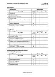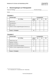 E LK HT 2 Ministerium für Schule und Weiterbildung NRW Seite 6 von 12 7. Bewertungsbogen zur Prüfungsarbeit Name des Prüflings: ____________________________________ Kursbezeichnung: ____________ Schule: _____________________________________________ Teilaufgabe 1 Anforderungen Lösungsqualität Der Prüfling maximal erreichbare Punktzahl 1 stellt dar, dass … 6 2 weist darauf hin … 6 3 führt aus, dass … 4 4 erfüllt ein weiteres aufgabenbezogenes Kriterium: (2) …………………………………………………………….. …………………………………………………………….. Summe 1. Teilaufgabe EK 2 ZK DK 16 Teilaufgabe 2 Anforderungen Lösungsqualität Der Prüfling 1 arbeitet heraus, dass … 6 2 analysiert, wie durch … 6 3 untersucht, wie Person … 6 4 vergleicht zusammenfassend mögliche … 6 5 erfüllt ein weiteres aufgabenbezogenes Kriterium: (4) …………………………………………………………….. …………………………………………………………….. Summe 2. Teilaufgabe 2 maximal erreichbare Punktzahl 24 EK = Erstkorrektur; ZK = Zweitkorrektur; DK = Drittkorrektur Nur für den Dienstgebrauch! EK ZK DK
