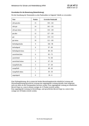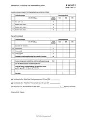 E LK HT 2 Ministerium für Schule und Weiterbildung NRW Seite 12 von 12 Sprachrichtigkeit maximal erreichbare Punktzahl Der Prüfling … beachtet die Normen der sprachlichen Korrektheit. 10. Wortschatz 0 – 1 Punkte In nahezu jedem Satz sind Schwächen im kor- rekten Gebrauch der Wörter feststellbar. Die Mängel im Wortgebrauch erschweren das Lesen und Textverständnis er- heblich und verursachen Missverständnisse. 2 – 5 Punkte Einzelne Sätze sind frei von lexikalischen Verstößen. Fehler beim Wortgebrauch beeinträchtigen z. T. das Lesen und Verstehen. 30 6 – 9 Punkte Vereinzelt ist eine fal- sche Wortwahl feststell- bar. Abschnitte bzw. Textpassagen sind weit- gehend frei von lexikali- schen Verstößen. 10 – 12 Punkte Der Wortgebrauch (Struktur- und Inhalts- wörter) ist fast über den gesamten Text hinweg korrekt. maximal erreichbare Punktzahl: 12 11. Grammatik 0 – 1 Punkte In nahezu jedem Satz ist wenigstens ein Verstoß gegen die grundlegenden Regeln der Grammatik feststellbar. Diese er- schweren das Lesen er- heblich und verursachen Missverständnisse. 2 – 5 Punkte Einzelne Sätze sind frei von Verstößen gegen grundlegende Regeln der Gramma- tik. Grammatikfehler beeinträchtigen z. T. das Lesen und Verstehen. 6 – 9 Punkte Es sind vereinzelt Ver- stöße gegen die Regeln der Grammatik fest- stellbar. Jedoch sind Abschnitte bzw. Text- passagen weitgehend frei von Grammatikfeh- lern. Das Lesen des Textes wird durch die auftretenden Gramma- tikfehler nicht er- schwert. 10 – 12 Punkte Der Text ist weitgehend frei von Verstößen gegen Regeln der Grammatik. Wenn Grammatikfehler auftreten, betreffen sie den komplexen Satz und sind ein Zeichen dafür, dass die Schülerin/der Schüler Risiken beim Verfassen des Textes eingeht, um sich dem Leser differenziert mit- zuteilen. maximal erreichbare Punktzahl: 12 12. Orthographie (Rechtschreibung und Zeichensetzung) 0 Punkte 1 – 2 Punkte 3 – 4 Punkte 5 – 6 Punkte In nahezu jedem Satz ist Einzelne Sätze sind Es sind zwar durchaus Der gesamte Text ist Orthographiefehler fest- weitgehend frei von Ver- wenigstens ein Verstoß frei von Verstößen stellbar, jedoch sind Ab- stößen gegen orthogra- gegen die Regeln der gegen orthographi- Orthographie feststellbar. sche Normen, Ortho- schnitte bzw. Textpassa- phische Normen. Wenn Die Orthographiefehler graphiefehler beein- gen weitgehend ohne vereinzelt Orthographie- Verstoß gegen orthogra- fehler auftreten, haben erschweren das Lesen trächtigen z. T. das erheblich und verursachen Lesen und Verstehen. phische Normen. Das sie den Charakter von Lesen des Textes wird Flüchtigkeitsfehlern, Missverständnisse. durch die auftretenden d. h., sie deuten nicht auf Orthographiefehler nicht Unkenntnis von Regeln wesentlich beeinträchtigt. hin. maximal erreichbare Punktzahl: 6 Nur für den Dienstgebrauch!