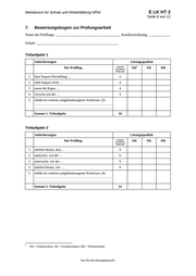 E LK HT 2 Ministerium für Schule und Weiterbildung NRW Seite 6 von 12 7. Bewertungsbogen zur Prüfungsarbeit Name des Prüflings: ____________________________________ Kursbezeichnung: ____________ Schule: _____________________________________________ Teilaufgabe 1 Anforderungen Lösungsqualität Der Prüfling maximal erreichbare Punktzahl 1 fasst Kapurs Darstellung … 4 2 stellt Kapurs Sicht … 4 3 nennt die Kapur … 4 4 verweist auf die … 4 5 erfüllt ein weiteres aufgabenbezogenes Kriterium: (2) …………………………………………………………….. …………………………………………………………….. Summe 1. Teilaufgabe EK 2 ZK DK 16 Teilaufgabe 2 Anforderungen Lösungsqualität Der Prüfling 1 arbeitet heraus, dass … 6 2 analysiert, wie der … 6 3 untersucht, wie der … 6 4 arbeitet heraus, wie … 6 5 erfüllt ein weiteres aufgabenbezogenes Kriterium: (4) …………………………………………………………….. …………………………………………………………….. Summe 2. Teilaufgabe 2 maximal erreichbare Punktzahl 24 EK = Erstkorrektur; ZK = Zweitkorrektur; DK = Drittkorrektur Nur für den Dienstgebrauch! EK ZK DK