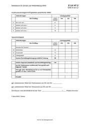 E LK HT 2 Ministerium für Schule und Weiterbildung NRW Seite 12 von 12 Sprachrichtigkeit maximal erreichbare Punktzahl Der Prüfling … beachtet die Normen der sprachlichen Korrektheit. 10. Wortschatz 0 – 1 Punkte In nahezu jedem Satz sind Schwächen im kor- rekten Gebrauch der Wörter feststellbar. Die Mängel im Wortgebrauch erschweren das Lesen und Textverständnis er- heblich und verursachen Missverständnisse. 2 – 5 Punkte Einzelne Sätze sind frei von lexikalischen Verstößen. Fehler beim Wortgebrauch beeinträchtigen z. T. das Lesen und Verstehen. 30 6 – 9 Punkte Vereinzelt ist eine fal- sche Wortwahl feststell- bar. Abschnitte bzw. Textpassagen sind weit- gehend frei von lexikali- schen Verstößen. 10 – 12 Punkte Der Wortgebrauch (Struktur- und Inhalts- wörter) ist fast über den gesamten Text hinweg korrekt. maximal erreichbare Punktzahl: 12 11. Grammatik 0 – 1 Punkte In nahezu jedem Satz ist wenigstens ein Verstoß gegen die grundlegenden Regeln der Grammatik feststellbar. Diese er- schweren das Lesen er- heblich und verursachen Missverständnisse. 2 – 5 Punkte Einzelne Sätze sind frei von Verstößen gegen grundlegende Regeln der Gramma- tik. Grammatikfehler beeinträchtigen z. T. das Lesen und Verstehen. 6 – 9 Punkte Es sind vereinzelt Ver- stöße gegen die Regeln der Grammatik fest- stellbar. Jedoch sind Abschnitte bzw. Text- passagen weitgehend frei von Grammatikfeh- lern. Das Lesen des Textes wird durch die auftretenden Gramma- tikfehler nicht er- schwert. 10 – 12 Punkte Der Text ist weitgehend frei von Verstößen gegen Regeln der Grammatik. Wenn Grammatikfehler auftreten, betreffen sie den komplexen Satz und sind ein Zeichen dafür, dass die Schülerin/der Schüler Risiken beim Verfassen des Textes eingeht, um sich dem Leser differenziert mit- zuteilen. maximal erreichbare Punktzahl: 12 12. Orthographie (Rechtschreibung und Zeichensetzung) 0 Punkte 1 – 2 Punkte 3 – 4 Punkte 5 – 6 Punkte In nahezu jedem Satz ist Einzelne Sätze sind Es sind zwar durchaus Der gesamte Text ist Orthographiefehler fest- weitgehend frei von Ver- wenigstens ein Verstoß frei von Verstößen stellbar, jedoch sind Ab- stößen gegen orthogra- gegen die Regeln der gegen orthographi- Orthographie feststellbar. sche Normen, Ortho- schnitte bzw. Textpassa- phische Normen. Wenn Die Orthographiefehler graphiefehler beein- gen weitgehend ohne vereinzelt Orthographie- Verstoß gegen orthogra- fehler auftreten, haben erschweren das Lesen trächtigen z. T. das erheblich und verursachen Lesen und Verstehen. phische Normen. Das sie den Charakter von Lesen des Textes wird Flüchtigkeitsfehlern, Missverständnisse. durch die auftretenden d. h., sie deuten nicht auf Orthographiefehler nicht Unkenntnis von Regeln wesentlich beeinträchtigt. hin. maximal erreichbare Punktzahl: 6 Nur für den Dienstgebrauch!