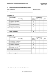 M GK HT 2 Ministerium für Schule und Weiterbildung NRW Seite 6 von 7 7. Bewertungsbogen zur Prüfungsarbeit Name des Prüflings:____________________________________ Kursbezeichnung:____________ Schule: _____________________________________________ Teilaufgabe a) Anforderungen Lösungsqualität Der Prüfling maximal erreichbare Punktzahl 1 (1) vergleicht die Graphen … 5 2 (2) gibt die Ozonkonzentrationen … 2 3 (3) bestimmt den Zeitpunkt … 9 4 (3) berechnet die höchste … 2 EK 2 ZK DK sachlich richtige Alternativen: (18) ……………………………………………………………………. ……………………………………………………………………. Summe Teilaufgabe a) 18 Teilaufgabe b) Anforderungen Lösungsqualität Der Prüfling maximal erreichbare Punktzahl 1 (1) bestimmt die Wendestelle … 7 2 (1) ermittelt die Zeitpunkte … 5 3 (2) erklärt die Bedeutung … 4 4 (3) ermittelt eine Gleichung … 5 5 (4) begründet, dass die … 3 sachlich richtige Alternativen: (24) ……………………………………………………………………. ……………………………………………………………………. Summe Teilaufgabe b) 2 24 EK = Erstkorrektur; ZK = Zweitkorrektur; DK = Drittkorrektur Nur für den Dienstgebrauch! EK ZK DK