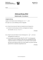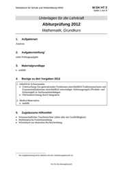 Ministerium für Schule und Weiterbildung NRW M GK HT 3 Seite 1 von 8 Unterlagen für die Lehrkraft Abiturprüfung 2012 Mathematik, Grundkurs 1. Aufgabenart Analysis 2. 1 Aufgabenstellung siehe Prüfungsaufgabe 3. Materialgrundlage entfällt 4. Bezüge zu den Vorgaben 2012 1. Inhaltliche Schwerpunkte Untersuchung von ganzrationalen Funktionen einschließlich Funktionenscharen und Exponentialfunktionen einschließlich notwendiger Ableitungsregeln (Produkt- und Kettenregel) in Sachzusammenhängen Flächenberechnung durch Integration 2. Medien/Materialien entfällt 5. Zugelassene Hilfsmittel Wissenschaftlicher Taschenrechner (ohne oder mit Grafikfähigkeit) Mathematische Formelsammlung Wörterbuch zur deutschen Rechtschreibung 1 Die Aufgabenstellung deckt inhaltlich alle drei Anforderungsbereiche ab. Nur für den Dienstgebrauch!