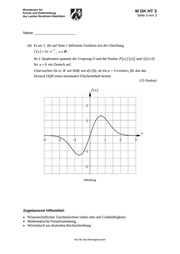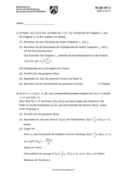 M GK HT 3 Seite 2 von 3 Name: _______________________ c) Im Punkt A 1 | f 1 bzw. im Punkt B 1 | f 1 wird jeweils die Tangente t A bzw. die Tangente t B an den Graphen von f gelegt. (1) Bestimmen Sie eine Gleichung der beiden Tangenten t A und t B . (2) Berechnen Sie die Koordinaten der Schnittpunkte der beiden Tangenten t A und t B mit den Koordinatenachsen. [Zur Kontrolle: Die Tangente t A schneidet die Koordinatenachsen in den Punkten 6 Ax 2 | 0 und Ay 0 | .] e Die Schnittpunkte aus c) (2) ergeben ein Viereck. (3) Erstellen Sie eine geeignete Skizze. (4) Begründen Sie, dass das genannte Viereck eine Raute ist. (5) Berechnen Sie den Flächeninhalt des genannten Vierecks. (17 Punkte) d) Es sei h : x h x , x IR , eine zweimal differenzierbare Funktion mit h x 0 für alle x 0 und h 0 0 . Man wählt für u 0 den Punkt Pu u | h u auf dem Graphen der Funktion h. Der Punkt Qu hat die Koordinaten u | 0 , und man betrachtet das Dreieck OQu Pu , wobei O der Ursprung ist. (1) Erstellen Sie eine geeignete Skizze. 1 (2) Begründen Sie, dass das Dreieck OQu Pu den Flächeninhalt A u u h u , u 0 , 2 besitzt. (3) Zeigen Sie: 1 Wenn uE eine Extremstelle der Funktion A mit der Gleichung A u u h u , u 0 , 2 h uE ist, so gilt h uE . uE Zeigen sie weiter: 1 Gilt zusätzlich die Aussage h uE uE h uE 0 , so ist A uE ein lokales 2 Maximum der Funktion A. Nur für den Dienstgebrauch!