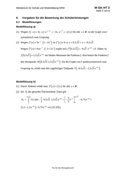 M GK HT 3 Ministerium für Schule und Weiterbildung NRW Seite 2 von 8 6. Vorgaben für die Bewertung der Schülerleistungen 6.1 Modelllösungen Modelllösung a) (1) Wegen f x 3 x e x 2 3 x e x2 f x für alle x IR ist der Graph von f symmetrisch zum Ursprung. (2) Wegen f x 3e x2 Wegen f x 6 xe x2 f 0,5 2 1,5 2 e 1 2x 2 ist f x 0 x 0,5 3 2 x 0,5 2 2 x 0,5 2 . ergibt sich f 0,5 2 6 2 e 0,5 0 . Daher ist ein lokales Maximum der Funktion f. Also besitzt die Funktion f . Da der Graph von f punktsymmetrisch zum Ursprung ist, erhält man den zugehörigen Tiefpunkt T 0,5 2 | 1,5 2 e . den Hochpunkt H 0,5 2 | 1,5 2 e 0,5 0,5 Modelllösung b) (1) Durch Ableiten erhält man F x f x für alle x IR . (2) Sei AF der gesuchte Flächeninhalt. Dann gilt 0,5 2 AF 0 0,5 2 1 3 x2 0,5 f x dx 0,5 2 1,5 2 e e 2 2 0 1,5 1,5 e 0,75 e 0,5 0,5 0,135 [FE]. Nur für den Dienstgebrauch! 0,75 e 0,5 =