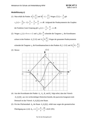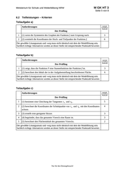 Ministerium für Schule und Weiterbildung NRW M GK HT 3 Seite 5 von 8 6.2 Teilleistungen – Kriterien Teilaufgabe a) maximal erreichbare Punktzahl Anforderungen Der Prüfling 1 (1) weist die Symmetrie des Graphen der Funktion f zum Ursprung nach. 3 2 (2) ermittelt die Koordinaten der Hoch- und Tiefpunkte der Funktion f. 6 Der gewählte Lösungsansatz und -weg muss nicht identisch mit dem der Modelllösung sein. Sachlich richtige Alternativen werden an dieser Stelle mit entsprechender Punktzahl bewertet. Teilaufgabe b) Anforderungen Der Prüfling maximal erreichbare Punktzahl 1 (1) zeigt, dass die Funktion F eine Stammfunktion der Funktion f ist. 3 2 (2) berechnet den Inhalt der in der Aufgabenstellung beschriebenen Fläche. 6 Der gewählte Lösungsansatz und -weg muss nicht identisch mit dem der Modelllösung sein. Sachlich richtige Alternativen werden an dieser Stelle mit entsprechender Punktzahl bewertet. Teilaufgabe c) maximal erreichbare Punktzahl Anforderungen Der Prüfling 1 (1) bestimmt eine Gleichung der Tangenten t A und t B . 5 2 (2) berechnet die Koordinaten der Schnittpunkte von t A und t B mit den Koordinaten- achsen. 4 3 (3) erstellt eine geeignete Skizze. 3 4 (4) begründet, dass das genannte Viereck eine Raute ist. 3 5 (5) berechnet den Flächeninhalt des genannten Vierecks. 2 Der gewählte Lösungsansatz und -weg muss nicht identisch mit dem der Modelllösung sein. Sachlich richtige Alternativen werden an dieser Stelle mit entsprechender Punktzahl bewertet. Nur für den Dienstgebrauch!