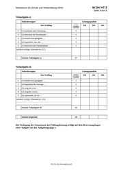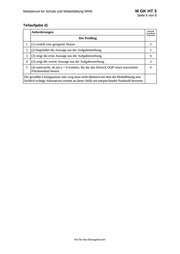 M GK HT 3 Ministerium für Schule und Weiterbildung NRW Seite 8 von 8 Teilaufgabe c) Anforderungen Lösungsqualität Der Prüfling maximal erreichbare Punktzahl 1 (1) bestimmt eine Gleichung … 5 2 (2) berechnet die Koordinaten … 4 3 (3) erstellt eine geeignete … 3 4 (4) begründet, dass das … 3 5 (5) berechnet den Flächeninhalt … 2 EK ZK DK sachlich richtige Alternativen: (17) ……………………………………………………………………. ……………………………………………………………………. Summe Teilaufgabe c) 17 Teilaufgabe d) Anforderungen Lösungsqualität Der Prüfling maximal erreichbare Punktzahl 1 (1) erstellt eine geeignete … 2 2 (2) begründet die Aussage … 2 3 (3) zeigt die erste … 4 4 (3) zeigt die zweite … 3 5 (4) untersucht, ob ein … 4 EK ZK sachlich richtige Alternativen: (15) ……………………………………………………………………. ……………………………………………………………………. Summe Teilaufgabe d) 15 Summe insgesamt 50 Die Festlegung der Gesamtnote der Prüfungsleistung erfolgt auf dem Bewertungsbogen einer Aufgabe aus der Aufgabengruppe 2. Nur für den Dienstgebrauch! DK