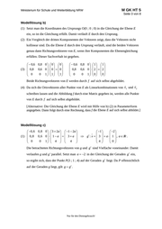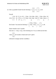 Ministerium für Schule und Weiterbildung NRW M GK HT 5 Seite 3 von 8 Modelllösung b) (1) Setzt man die Koordinaten des Ursprungs O(0 ; 0 ; 0) in die Gleichung der Ebene E ein, so ist die Gleichung erfüllt. Damit verläuft E durch den Ursprung. (2) Ein Vergleich der dritten Komponenten der Vektoren zeigt, dass die Vektoren nicht kollinear sind. Da die Ebene E durch den Ursprung verläuft, sind die beiden Vektoren genau dann Richtungsvektoren von E, wenn ihre Komponenten die Ebenengleichung erfüllen. Dieser Sachverhalt ist gegeben. 0,6 0,8 0 0 0 (3) 0,8 0,6 0 0 0 0 0 1 1 1 0,6 0,8 0 1 1 0,8 0,6 0 2 2 0 0 1 0 0 Beide Richtungsvektoren von E werden durch f auf sich selbst abgebildet. (4) Da sich die Ortsvektoren aller Punkte von E als Linearkombinationen von v1 und v2 schreiben lassen und die Abbildung f durch eine Matrix gegeben ist, werden alle Punkte von E durch f auf sich selbst abgebildet. [Alternative: Die Gleichung der Ebene E wird mit Hilfe von b) (2) in Parameterform angegeben. Dann folgt durch eine Rechnung, dass f die Ebene E auf sich selbst abbildet.] Modelllösung c) 0,6 0,8 0 3 2a 1 2a 1 2 (1) 0,8 0,6 0 1 a 3 a g : x 3 a 1 , a IR . 0 0 1 4 4 4 0 Die betrachteten Richtungsvektoren von g und g sind Vielfache voneinander. Damit verlaufen g und g’ parallel. Setzt man a 2 in der Gleichung der Geraden g ein, so ergibt sich, dass der Punkt P(3 ; 1 ; 4) auf der Geraden g liegt. Da P offensichtlich auf der Geraden g liegt, gilt g g . Nur für den Dienstgebrauch!