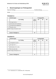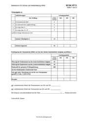 M GK HT 5 Ministerium für Schule und Weiterbildung NRW Seite 6 von 8 7. Bewertungsbogen zur Prüfungsarbeit Name des Prüflings:____________________________________ Kursbezeichnung:____________ Schule: _____________________________________________ Teilaufgabe a) Anforderungen Lösungsqualität Der Prüfling maximal erreichbare Punktzahl 1 (1) zeigt, dass das … 7 2 (2) berechnet die Koordinaten … 3 3 (2) untersucht das Bilddreieck … 7 4 (3) prüft, ob die … 3 EK 2 ZK DK sachlich richtige Alternativen: (20) ……………………………………………………………………. ……………………………………………………………………. Summe Teilaufgabe a) 20 Teilaufgabe b) Anforderungen Lösungsqualität Der Prüfling maximal erreichbare Punktzahl 1 (1) begründet, dass die … 3 2 (2) zeigt, dass v1 … 4 3 (3) bestimmt f v1 und … 6 4 (4) weist nach, dass … 4 sachlich richtige Alternativen: (17) ……………………………………………………………………. ……………………………………………………………………. Summe Teilaufgabe b) 2 17 EK = Erstkorrektur; ZK = Zweitkorrektur; DK = Drittkorrektur Nur für den Dienstgebrauch! EK ZK DK