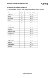 M GK HT 5 Ministerium für Schule und Weiterbildung NRW Seite 8 von 8 Grundsätze für die Bewertung (Notenfindung) Für die Zuordnung der Notenstufen zu den Punktzahlen ist folgende Tabelle zu verwenden: Note Punkte Erreichte Punktzahl sehr gut plus 15 100 – 95 sehr gut 14 94 – 90 sehr gut minus 13 89 – 85 gut plus 12 84 – 80 gut 11 79 – 75 gut minus 10 74 – 70 befriedigend plus 9 69 – 65 befriedigend 8 64 – 60 befriedigend minus 7 59 – 55 ausreichend plus 6 54 – 50 ausreichend 5 49 – 45 ausreichend minus 4 44 – 39 mangelhaft plus 3 38 – 33 mangelhaft 2 32 – 27 mangelhaft minus 1 26 – 20 ungenügend 0 19 – 0 Nur für den Dienstgebrauch!