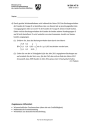 M GK HT 6 Seite 3 von 3 Name: _______________________ d) Durch gezielte Werbemaßnahmen wird während des Jahres 2012 das Buchungsverhalten der Kunden der Gruppe K so beeinflusst, dass von diesem Jahr an jeweils gegenüber dem vorangegangenen Jahr nur noch 5 % der Kunden der Gruppe K keinen Urlaub buchen. Dabei wird das Buchungsverhalten der Kunden der beiden anderen Kundengruppen E und M nicht beeinflusst. Es wird weiterhin von einer konstanten Anzahl von Stamm- kunden ausgegangen. (1) Erklären Sie, dass das Buchungsverhalten dann durch eine Matrix q 0,8 0,2 Β 0,1 0,6 0,95 q mit 0 q 0,95 beschrieben werden kann. 0,1 0,2 0,05 (2) Gehen Sie von den in Teilaufgabe b) für das Jahr 2011 angegebenen Buchungen aus und ermitteln Sie den Wert von q für den Fall, dass sich am Ende des Jahres 2012 herausstellt, dass 2699 Kunden im Jahr 2012 genau einen Urlaub gebucht haben. (11 Punkte) Zugelassene Hilfsmittel: Wissenschaftlicher Taschenrechner (ohne oder mit Grafikfähigkeit) Mathematische Formelsammlung Wörterbuch zur deutschen Rechtschreibung Nur für den Dienstgebrauch!