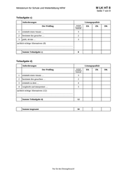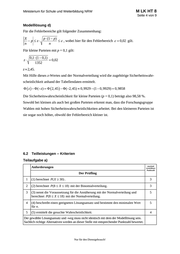 M LK HT 8 Ministerium für Schule und Weiterbildung NRW Seite 6 von 9 7. Bewertungsbogen zur Prüfungsarbeit Name des Prüflings:____________________________________ Kursbezeichnung:____________ Schule: _____________________________________________ Teilaufgabe a) Anforderungen Lösungsqualität Der Prüfling maximal erreichbare Punktzahl 1 (1) berechnet P( X 30) . 3 2 (2) berechnet P(8 X 18) mit … 3 3 (3) nennt die Voraussetzung … 5 4 (4) beschreibt einen geeigneten … 5 5 (5) ermittelt die gesuchte … 4 EK 2 ZK DK sachlich richtige Alternativen: (20) ……………………………………………………………………. ……………………………………………………………………. Summe Teilaufgabe a) 20 Teilaufgabe b) Anforderungen Lösungsqualität Der Prüfling maximal erreichbare Punktzahl 1 bestimmt einen Ansatz … 5 2 ermittelt die Grenzen … 5 sachlich richtige Alternativen: (10) ……………………………………………………………………. ……………………………………………………………………. Summe Teilaufgabe b) 2 10 EK = Erstkorrektur; ZK = Zweitkorrektur; DK = Drittkorrektur Nur für den Dienstgebrauch! EK ZK DK