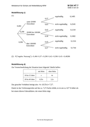 M GK HT 7 Ministerium für Schule und Weiterbildung NRW Seite 3 von 10 Modelllösung c) (1) regelmäßig 0,1495 0,63 nicht regelmäßig 0,2545 0,42 regelmäßig 0,1218 0,58 nicht regelmäßig 0,1682 0,43 regelmäßig 0,1316 0,57 nicht regelmäßig 0,1744 0,37 unter 20 000 Einwohner 0,404 0,290 20 000 bis 100 000 Einwohner 0,306 über 100 000 Einwohner (2) P "regelm. Nutzung" 0, 404 0,37 0,290 0, 42 0,306 0, 43 0, 40286 Modelllösung d) Zur Veranschaulichung der Situation kann folgende Tabelle helfen: mit Helm ohne Helm 10 bis 15 Jahre x 4x 20 bis 40 Jahre 0,55x 2,2x Das gesuchte Verhältnis beträgt also: 4 x : (0,55 x ) 7,27 . Damit ist das Verletzungsrisiko auf das ca. 7,27-Fache erhöht, es ist um ca. 627 % höher als bei einem älteren Fahrradfahrer, der einen Helm trägt. Nur für den Dienstgebrauch!