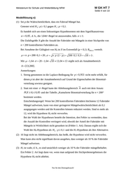 Ministerium für Schule und Weiterbildung NRW M GK HT 7 Seite 4 von 10 Modelllösung e) (1) Sei p die Wahrscheinlichkeit, dass ein Fahrrad Mängel hat. Getestet wird H 0 : p 0,1 gegen H 1 : p < 0,1. Es handelt sich um einen linksseitigen Hypothesentest mit dem Signifikanzniveau 0,05 , d. h., die 1,64 -Regel ist anzuwenden, falls 3 . Die Zufallsgröße X gibt die Anzahl der Fahrräder mit Mängeln in einer Stichprobe von n = 200 kontrollierten Fahrrädern an. Bei Annahme der Gültigkeit von H0 ist X im Extremfall (p = 0,1) B200;0,1 -verteilt. n p 200 0,1 20 , n p (1 p ) 200 0,1 0,9 18 3 . Mit 1,64 20 1,64 18 13,04 13 ergibt sich als Annahmebereich A [13;200] . Anmerkungen: 1. Streng genommen ist die Laplace-Bedingung für p 0,953 nicht mehr erfüllt, für dieses p ist aber der Annahmebereich auf Grund der Eigenschaften der Binomial- verteilung sowieso geeignet. 2. Statt mit einer -Regel kann der Ablehnungsbereich A auch mit dem Ansatz P( X k ) 0,05 und der Tabelle „Kumulierte Binomialverteilung für n = 200“ bestimmt werden. Entscheidungsregel: Wenn bei 200 kontrollierten Fahrrädern höchstens 12 Fahrräder Mängel aufweisen, kann von einer geringeren Mängelwahrscheinlichkeit als 0,1 ausgegangen werden und die Kontrollen können reduziert werden. Sind es mehr als 12, wird die Hypothese H0 nicht verworfen. Bei der Wahl der Hypothesen besteht die Intention, den Fehler zu vermeiden, dass die Anzahl der Kontrollen verringert wird, obwohl der Anteil der Fahrräder mit Mängeln in Wirklichkeit nicht gesunken ist (Fehler 1. Art). Daraus ergibt sich die Wahl der H0-Hypothese als H 0 : p 0,1 und die H1-Hypothese als ihre Alternative. (2) 16 liegt nicht im Ablehnungsbereich, das heißt, die Hypothese wird nicht verworfen. Man kann also nicht signifikant davon ausgehen, dass weniger als 10 % der Fahrräder Mängel aufweisen. (3) H1 ist wahr, d. h., es sind tatsächlich weniger als 10 % der Fahrräder mängelbehaftet. Ein Fehler 2. Art liegt dann vor, wenn man aufgrund des Stichprobenergebnisses die Hypothese H0 nicht ablehnt. Nur für den Dienstgebrauch!