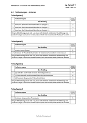 Ministerium für Schule und Weiterbildung NRW M GK HT 7 Seite 5 von 10 6.2 Teilleistungen – Kriterien Teilaufgabe a) maximal erreichbare Punktzahl Anforderungen Der Prüfling 1 berechnet die Wahrscheinlichkeit für das Ereignis E1. 2 2 berechnet die Wahrscheinlichkeit für das Ereignis E2. 3 3 berechnet die Wahrscheinlichkeit für das Ereignis E3. 3 Der gewählte Lösungsansatz und -weg muss nicht identisch mit dem der Modelllösung sein. Sachlich richtige Alternativen werden an dieser Stelle mit entsprechender Punktzahl bewertet. Teilaufgabe b) Anforderungen Der Prüfling maximal erreichbare Punktzahl 1 ermittelt einen Ansatz. 2 2 bestimmt die Anzahl der Fahrräder, die mindestens kontrolliert werden müssen. 4 Der gewählte Lösungsansatz und -weg muss nicht identisch mit dem der Modelllösung sein. Sachlich richtige Alternativen werden an dieser Stelle mit entsprechender Punktzahl bewertet. Teilaufgabe c) Anforderungen Der Prüfling maximal erreichbare Punktzahl 1 (1) stellt den Sachverhalt in einem Baumdiagramm dar. 4 2 (1) berechnet alle resultierenden Pfadwahrscheinlichkeiten. 6 3 (2) bestimmt die gesuchte Wahrscheinlichkeit. 3 Der gewählte Lösungsansatz und -weg muss nicht identisch mit dem der Modelllösung sein. Sachlich richtige Alternativen werden an dieser Stelle mit entsprechender Punktzahl bewertet. Teilaufgabe d) Anforderungen Der Prüfling 1 bestimmt den gesuchten Prozentsatz. Der gewählte Lösungsansatz und -weg muss nicht identisch mit dem der Modelllösung sein. Sachlich richtige Alternativen werden an dieser Stelle mit entsprechender Punktzahl bewertet. Nur für den Dienstgebrauch! maximal erreichbare Punktzahl 5