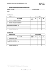 M GK HT 7 Ministerium für Schule und Weiterbildung NRW Seite 8 von 10 Teilaufgabe c) Anforderungen Lösungsqualität Der Prüfling maximal erreichbare Punktzahl 1 (1) stellt den Sachverhalt … 4 2 (1) berechnet alle resultierenden … 6 3 (2) bestimmt die gesuchte … 3 EK ZK DK sachlich richtige Alternativen: (13) ……………………………………………………………………. ……………………………………………………………………. Summe Teilaufgabe c) 13 Teilaufgabe d) Anforderungen Lösungsqualität Der Prüfling 1 bestimmt den gesuchten … maximal erreichbare Punktzahl EK ZK DK 5 sachlich richtige Alternativen: (5) ……………………………………………………………………. ……………………………………………………………………. Summe Teilaufgabe d) 5 Teilaufgabe e) Anforderungen Lösungsqualität Der Prüfling maximal erreichbare Punktzahl 1 (1) ermittelt geeignete Hypothesen. 4 2 (1) ermittelt eine Entscheidungsregel. 6 3 (1) begründet die Wahl … 3 4 (2) gibt eine begründete … 2 5 (3) beschreibt den Fehler … 3 sachlich richtige Alternativen: (18) ……………………………………………………………………. ……………………………………………………………………. Summe Teilaufgabe e) 18 Summe insgesamt 50 Nur für den Dienstgebrauch! EK ZK DK