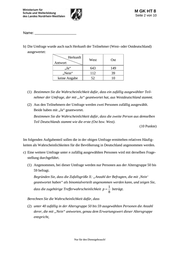 M GK HT 8 Seite 1 von 10 Name: _______________________ Abiturprüfung 2013 Mathematik, Grundkurs Aufgabenstellung: Bundeslandwirtschaftsministerin Ilse Aigner hat im April 2009 den Anbau von Gen-Mais in Deutschland verboten, da ihrer Ansicht nach Risiken für die Umwelt nicht ausgeschlossen werden konnten. Im Januar 2010 fand eine repräsentative Umfrage unter der deutschen Bevölkerung mit folgender Fragestellung statt: „Sollte der Anbau von Gen-Mais in Deutsch- land weiterhin verboten bleiben?“ Die Tabelle gibt die Ergebnisse der Umfrage nach Altersgruppen aufgeschlüsselt wieder: Altersgruppe 14 bis 29 Jahre 30 bis 39 Jahre 40 bis 49 Jahre 50 bis 59 Jahre 60 Jahre und älter „Ja“ 166 112 153 129 232 „Nein“ 33 24 30 19 45 keine Angabe 12 14 8 4 24 Anzahl der Befragten 211 150 191 152 301 Antwort a) (1) Eine Person wird zufällig aus den 1005 Teilnehmern der Umfrage ausgewählt. Bestimmen Sie die Wahrscheinlichkeit dafür, dass sie keine Angabe gemacht hat. (2) Unter den Befragten der Altersgruppe 14 bis 29 befanden sich 57 Schüler. Von diesen 2 antworteten mit „Ja“. 3 Bestimmen Sie den Anteil der Nicht-Schüler unter den 14- bis 29-Jährigen, die mit „Ja“ geantwortet haben. (8 Punkte) Nur für den Dienstgebrauch!