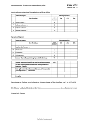 E GK HT 2 Ministerium für Schule und Weiterbildung NRW Seite 12 von 12 Sprachrichtigkeit maximal erreichbare Punktzahl Der Prüfling … beachtet die Normen der sprachlichen Korrektheit. 10. Wortschatz 0 – 1 Punkte In nahezu jedem Satz sind Schwächen im kor- rekten Gebrauch der Wörter feststellbar. Die Mängel im Wortgebrauch erschweren das Lesen und Textverständnis er- heblich und verursachen Missverständnisse. 2 – 5 Punkte Einzelne Sätze sind frei von lexikalischen Verstößen. Fehler beim Wortgebrauch beeinträchtigen z. T. das Lesen und Ver- stehen. 30 6 – 9 Punkte Vereinzelt ist eine fal- sche Wortwahl feststell- bar. Abschnitte bzw. Textpassagen sind weit- gehend frei von lexikali- schen Verstößen. 10 – 12 Punkte Der Wortgebrauch (Struktur- und Inhalts- wörter) ist fast über den gesamten Text hinweg korrekt. maximal erreichbare Punktzahl: 12 11. Grammatik 0 – 1 Punkte In nahezu jedem Satz ist wenigstens ein Verstoß gegen die grundlegenden Regeln der Grammatik feststellbar. Diese er- schweren das Lesen er- heblich und verursachen Missverständnisse. 2 – 5 Punkte Einzelne Sätze sind frei von Verstößen gegen grundlegende Regeln der Gramma- tik. Grammatikfehler beeinträchtigen z. T. das Lesen und Ver- stehen. 6 – 9 Punkte Es sind vereinzelt Ver- stöße gegen die Regeln der Grammatik fest- stellbar. Jedoch sind Abschnitte bzw. Text- passagen weitgehend frei von Grammatikfeh- lern. Das Lesen des Textes wird durch die auftretenden Gramma- tikfehler nicht er- schwert. 10 – 12 Punkte Der Text ist weitgehend frei von Verstößen gegen Regeln der Grammatik. Wenn Grammatikfehler auftreten, betreffen sie den komplexen Satz und sind ein Zeichen dafür, dass die Schülerin/der Schüler Risiken beim Verfassen des Textes eingeht, um sich dem Leser differenziert mit- zuteilen. maximal erreichbare Punktzahl: 12 12. Orthographie (Rechtschreibung und Zeichensetzung) 0 Punkte 1 – 2 Punkte 3 – 4 Punkte 5 – 6 Punkte In nahezu jedem Satz ist Einzelne Sätze sind Es sind zwar durchaus Der gesamte Text ist Orthographiefehler fest- weitgehend frei von Ver- wenigstens ein Verstoß frei von Verstößen stellbar, jedoch sind Ab- stößen gegen orthogra- gegen die Regeln der gegen orthographi- Orthographie feststellbar. sche Normen, Ortho- schnitte bzw. Textpassa- phische Normen. Wenn Die Orthographiefehler graphiefehler beein- gen weitgehend ohne vereinzelt Orthographie- Verstoß gegen orthogra- fehler auftreten, haben erschweren das Lesen trächtigen z. T. das erheblich und verursachen Lesen und Verstehen. phische Normen. Das sie den Charakter von Lesen des Textes wird Flüchtigkeitsfehlern, Missverständnisse. durch die auftretenden d. h., sie deuten nicht auf Orthographiefehler nicht Unkenntnis von Regeln wesentlich beeinträchtigt. hin. maximal erreichbare Punktzahl: 6 Nur für den Dienstgebrauch!
